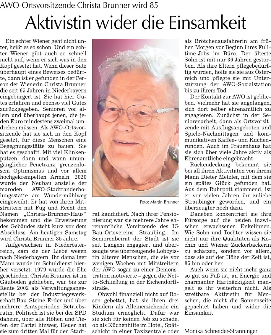 - 85 Jahre - ein Leben für die Gemeinschaft. Herzlichen Glückwunsch, liebe Christa Brunner!
