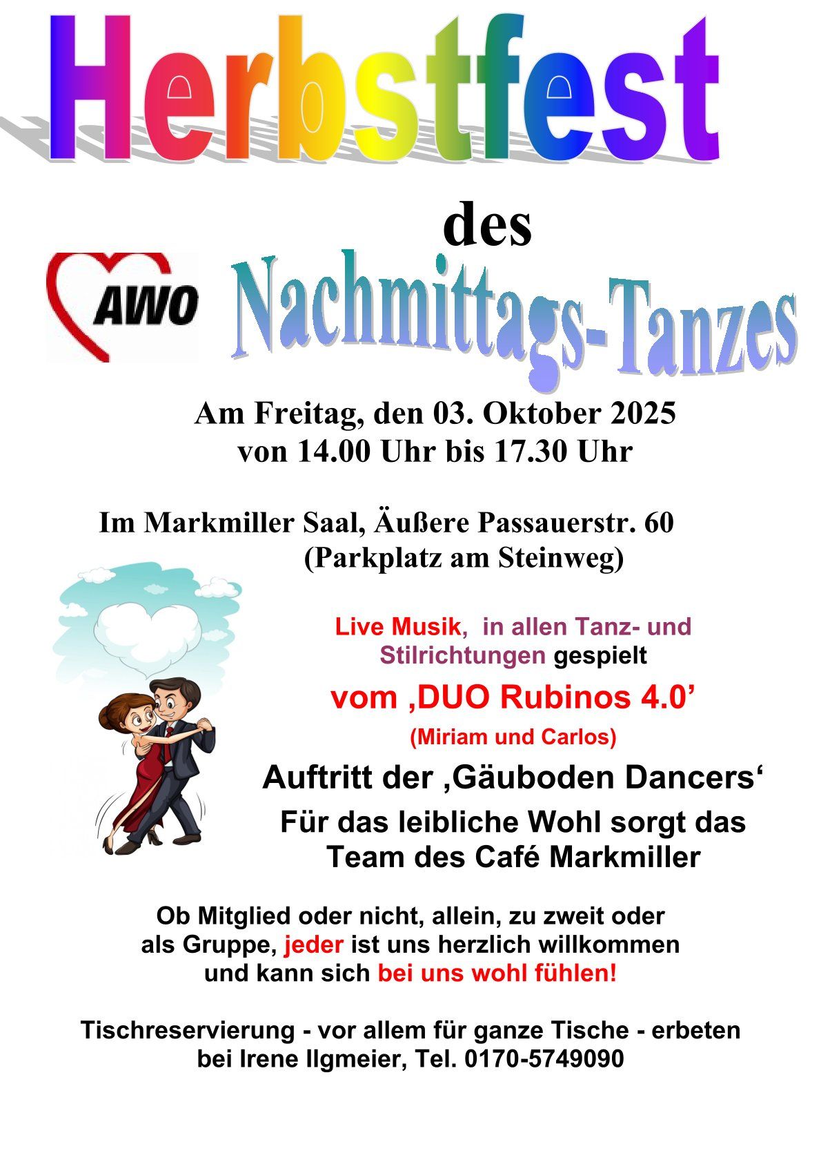 Am Freitag, den 3. Oktober 2025 von 14:00 bis 17:30 Uhr laden wir herzlich zum AWO Herbst-Fest in den Magnobonus-Markmiller-Saal ein.