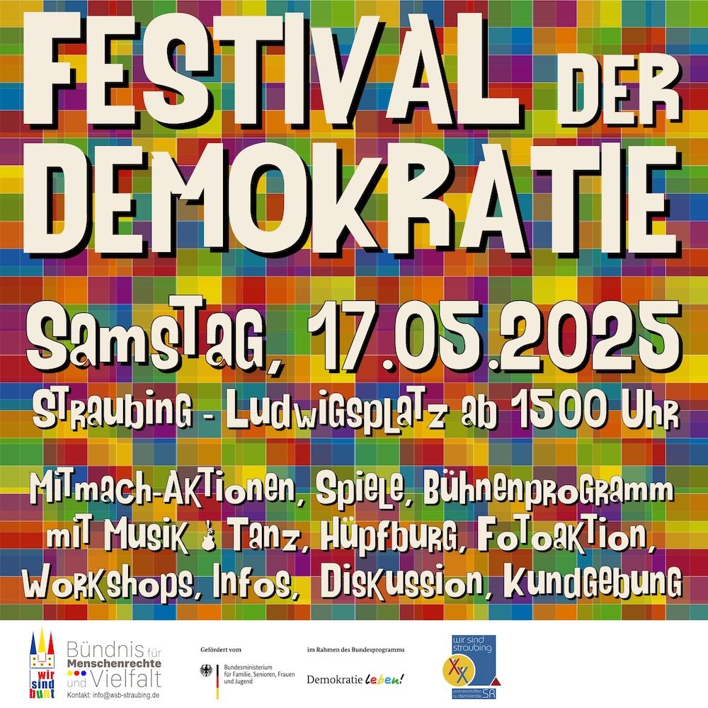 Kommt zum Festival der Demokratie am Samstag, 17. Mai 2025, ab 15:00 Uhr auf dem Ludwigsplatz in Straubing!
