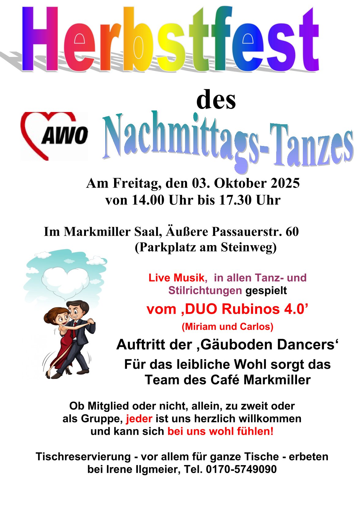 Am Freitag, den 3. Oktober 2025 von 14:00 bis 17:30 Uhr laden wir herzlich zum AWO Herbst-Fest in den Magnobonus-Markmiller-Saal ein.